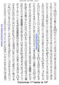 5) Que las diferentes interpretaciones de los jeroglíficos, dispares, contradictorias y sin relación alguna entre los mismos investigadores, más las varias falsificaciones realizadas por muchos de ellos, nos hacen dudar de que alguien haya conseguido realmente descifrar las claves jeroglíficas, sabiendo los hermetistas, que tienen casi todos los textos, en los casi medio millón de metros cuadrados aún existentes en Egipto (sin contar dinteles y columnas) dos niveles de lectura posible y a veces combinada: Ideográfica y/o hermética. Siempre que se asocie a un grabado, la lectura principal será ideográfica. Cuando está encartuchada será hermética. En ningún caso la lectura jeroglífica puede ser fonética, aunque los que los escribían tuvieran un idioma fonético, del que pudo quedar buena parte del mismo en la escritura demótica (que TAMPOCO ha sido traducida realmente). ¿Acaso es posible "leer fonéticamente" una ecuación matemática? Un chino, un árabe, un inglés, un senegalés, un hindú o un marciano que no sepan una palabra del idioma de los demás, pero que conozcan los números y las matemáticas, no podrán cambiar ni un concepto verbalmente, pero lo podrán hacer con números. Lo mismo ocurre con las notas musicales, que equivalen a una vibración, a un sonido que será análogo en cualquier instrumento que utilicen.