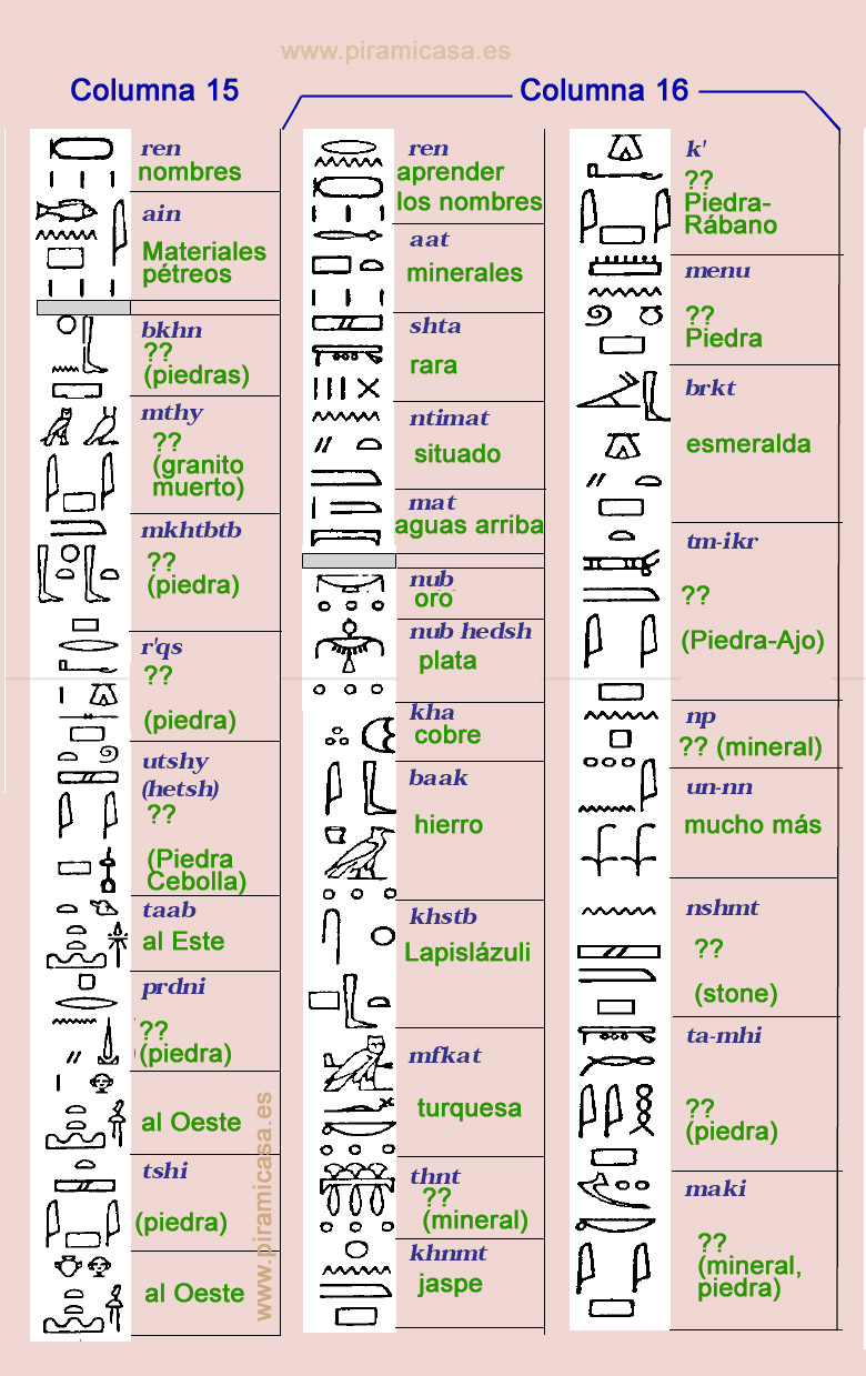 Diez de las treinta y dos columnas de jeroglíficos (un tercio de la estela) se ocupan esencialmente de minerales, materiales y piedras. Esta revelación se produce en las columnas 10 a 20. Nos estamos centrando en este pasaje. Lo que sigue es la versión en Inglés de Lichtheim: