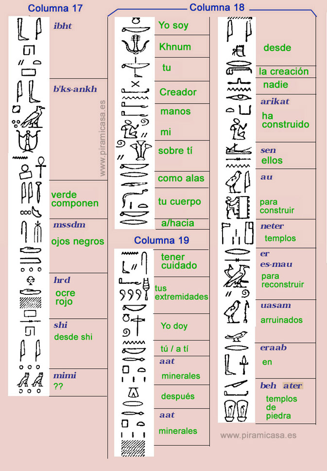 (Col. 19) para proteger tus extremidades. Yo imparto a vosotros piedras sobre piedras (que no se encontraron antes) desde antes que exista el trabajo, antes que se realizara la construcción de templos, la reconstrucción de las ruinas, adornar los ojos de las estatuas. Porque yo soy el maestro que hace, yo soy el que se hizo Nun exaltado, quien llegó por primera vez a otro, feliz quien